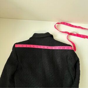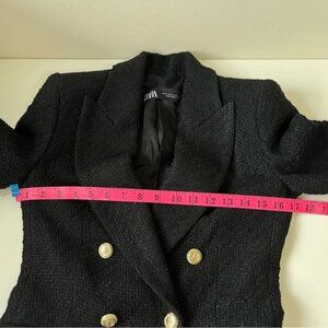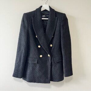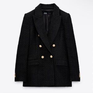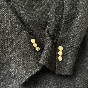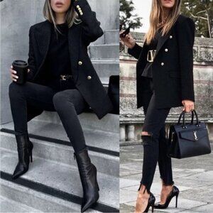 Elegant black blazer with gold buttons. Double-breasted design. Perfect for formal occasions.