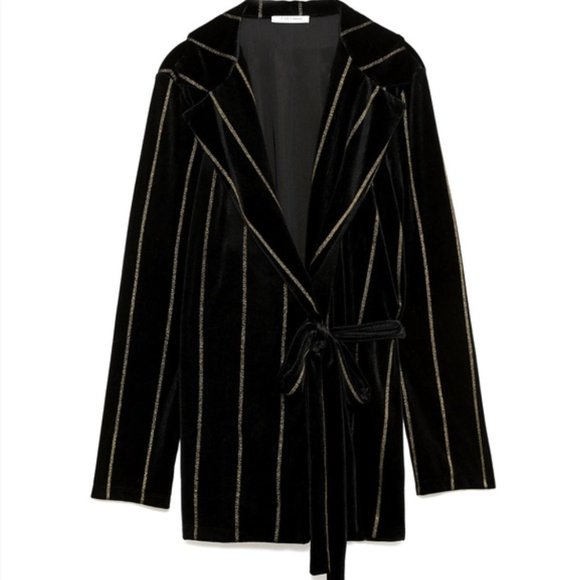 Zara Black Velvet Belted Blazer With Gold Stripes