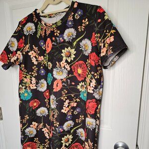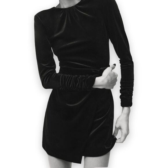 Black Velvet Mini Dress with gathered round neck and long sleeves with elastic ruching. Shoulder pads and front knot Rosette Back V-neckline, faux wrap front skirt detail. Back hidden in seam zip closure. BNWT
