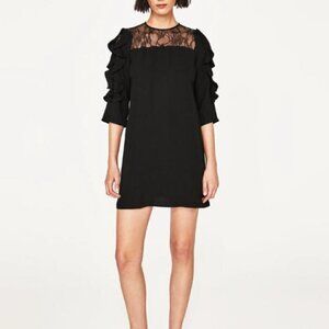 Zara Black Velvet Front Knot Flower V-Neck Back Long Sleeve Mini Dress US XS
