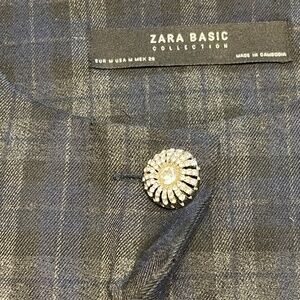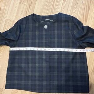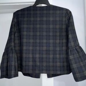 Zara "Black Watch'" (M) jacket with ruffle sleeves and rhinestone button