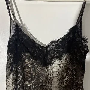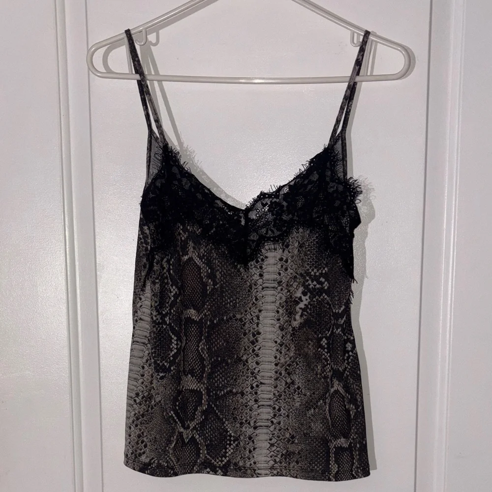 Stylish snake print tank top. Features black lace trim. Perfect for layering or wearing alone.
