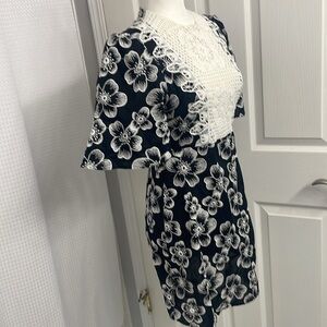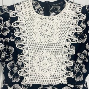 Zara black and white floral dress features intricate crochet pattern on the front of the dress. Hidden zipper in the back of the dress is 19 inches long.