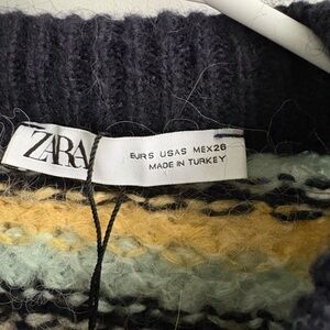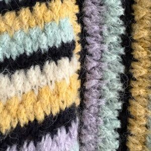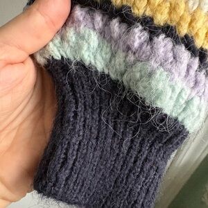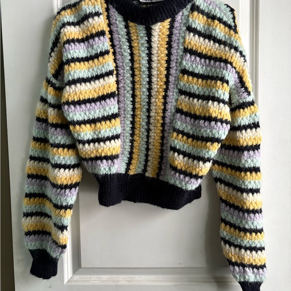 Chic striped sweater with vibrant colors. Features crew neck and cozy fit. Ideal for casual wear.