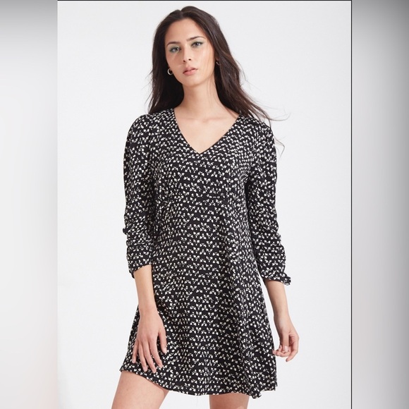 Chic mini dress with a V-neckline. Features a black base with white floral pattern. Perfect for casual outings.