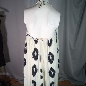 This chic sundress from Zara showcases a bold black and white pattern, perfect for resort wear. The sleeveless design with spaghetti straps and a backless feature adds a touch of elegance to its casual style.
