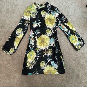Zara Black satin floral flower print long sleeve high neck mini dress Sz S NWOT