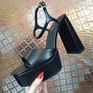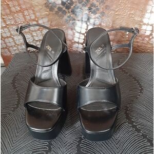 Step out in style with Zara's black faux leather platform heel sandals. Perfect for any occasion, these shoes offer both comfort and elegance. Silvertone buckle with ankle strap. Worn just twice. Minor wear on soles, minor scratches on back of heels as well as on top of right shoe, see pics for reference!