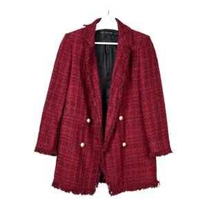 Zara Blogger Favourite Long Tweed Blazer Burgundy. Longer length red and burgundy tweed blazer. Fringed edge all around top, front, hem, and cuffs. Open front. Fully lined. Embellished faux double breasted buttons. Small shoulder pads. Care/Materials tags removed. No other known flaws.