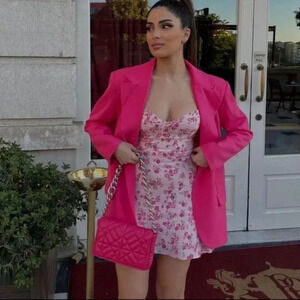 Zara Bloggers Favorite Pink Floral Lace Up Cutout Strappy Linen Blend Mini Dress Size Large.