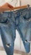Chic jeans with a light blue wash. Features pearl embellishments and distressed accents. Ideal for a trendy look.