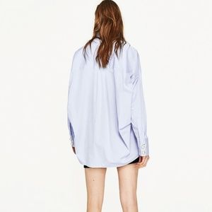 This is an oversized light blue shirt from Zara. It features pearls in two colours on the left side and two pearls on the sleeves. It has a V-neck and it is long enough in the back to cover the butt.