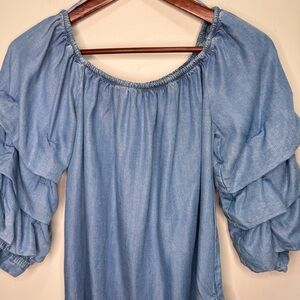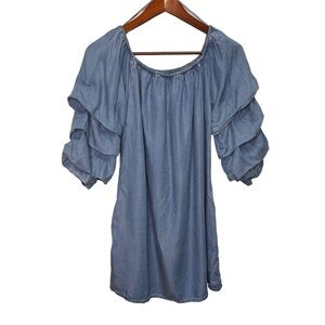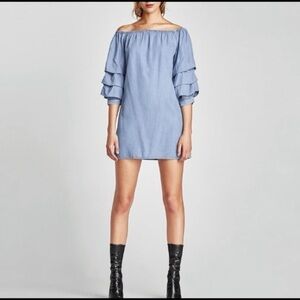 Zara Woman’s Premium Denim Collection Off The Shoulder Chambray Dress With Tiered Ruffle Sleeves.
