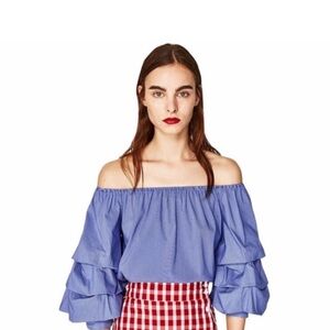 Zara Blue Stripes Off-Shoulder Ruffle Cotton Blouse size XS