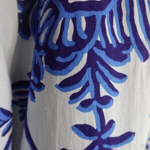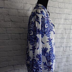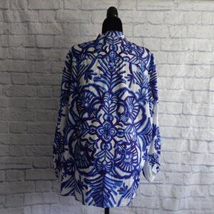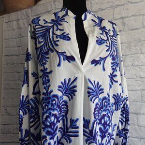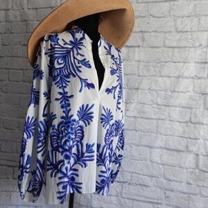 Zara Blue White Print Blouse. Never worn. Round collar blouse with V-neck front and long sleeves with elastic cuffs. Front pleat detail. Asymmetric hem with side vents. This beautiful Zara 100% cotton tunic blouse can be dressed up or down. Styling accessories not included- listing is for blouse only.