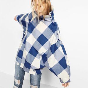 Stylish checkered top. Features blue and white pattern. High neckline. Loose fit. Perfect for casual wear.