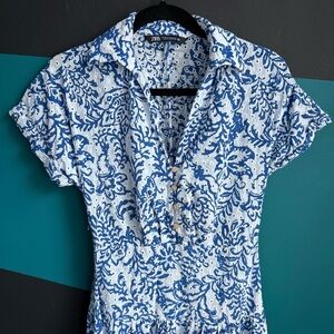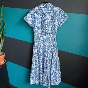 Elegant midi dress with floral patterns. Features a flattering wrap style and short sleeves. Perfect for any occasion.