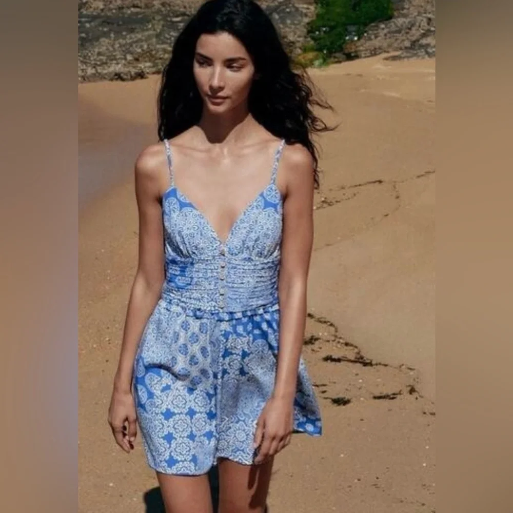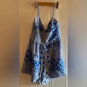 Stylish blue and white jumpsuit. Features intricate patterns. Perfect for casual outings.