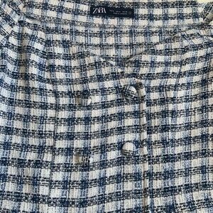 Zara Blue and White Tweed Off-Shoulder Crop Top - Small
