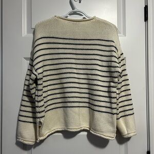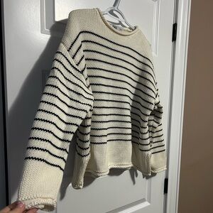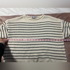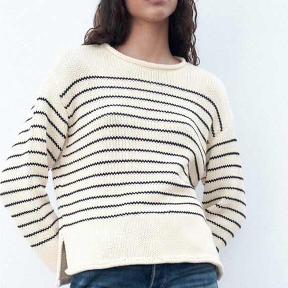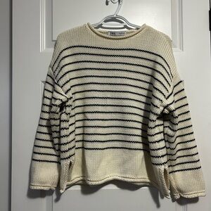 Chic striped sweater by Zara. Features cream and navy blue nautical beach vibes design. Ideal for casual wear.