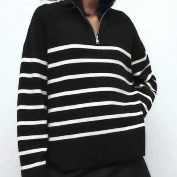 Zara π Breton Striped Sweater with 3/4 Zip. Side slits and slightly longer in back. Also featuring a V-funnel ribbed neck, silver tone zip fastening and long sleeves. Black and Off White Mariner Striped Relaxed fit Size Small or Medium (see measures for preferred fit).