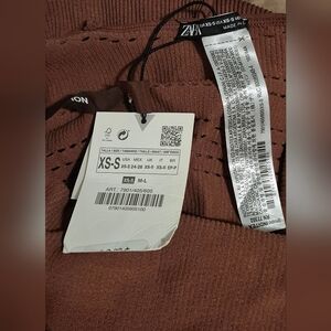 Embrace a chic and comfortable look with this Zara jumpsuit, crafted in a warm brown hue. The sleeveless design with spaghetti straps offers a relaxed fit, perfect for any casual occasion. Its subtle textured pattern adds a unique touch to this versatile piece.
