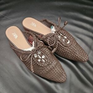 Zara Brown Woven Slip On Mules Slides With Bows Dress Shoes Women’s Size 37 6.5
