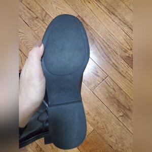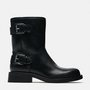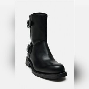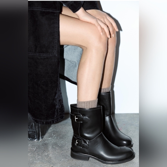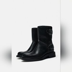 Very cute ankle boots from Zara. New on tags. Completely forgotten on my old apt so selling now as I do have similar models purchased recently. Pull on boots. No zipper. Round to almond toe shoe. Metallic buckle details. NWT. Size EU 36.