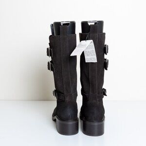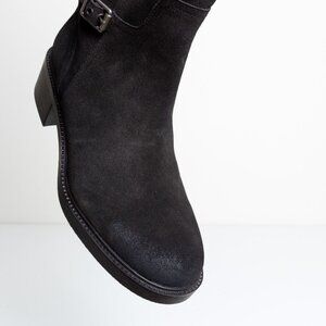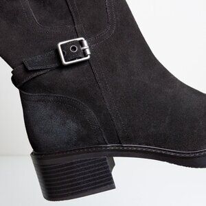Split leather boots. Topstitching detail on the upper and buckled straps on the shaft. Easy design with back pull tab. No zipper. Mid-height block heel. Round toe.