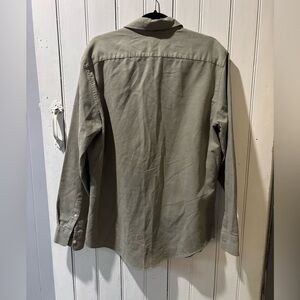 Lapel collar and long sleeves with buttoned cuffs. Front button closure.