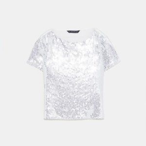 Zara COMBINED SEQUIN BLOUSE T-Shirt Top White/Silver Size XS