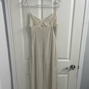This stunning cream slip dress from Zara features a sleek spaghetti strap gathered front neckline, perfect for a formal gathering or summer wedding. The dress is crafted with a fabric that drapes beautifully, offering a sophisticated and elegant look. Easy to slip into with a side hidden zipper. Its minimalist style is an ideal choice for both wedding guests or an elegant party.