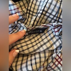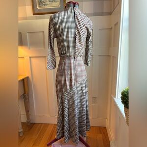 Elegant checkered dress with three-quarter sleeves. Features a blend of red, black, and white patterns.