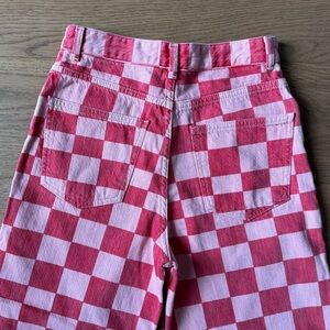 Zara wide leg red and pink checkered jeans.
