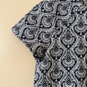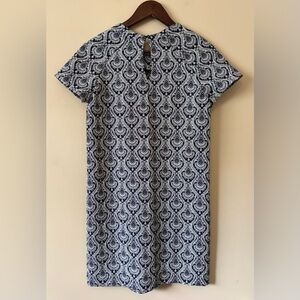 This Zara dress features a striking navy and ivory brocade geometric pattern, perfect for casual or work settings. Size XS, in good pre-owned condition, laundered and ready to wear.