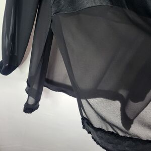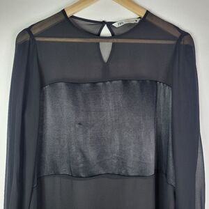 Elegant sheer black long sleeve chiffon blouse from Zara with a satin panel across the bust and upper torso area in the front. Satin is continued in a band along the hemline front and back as well as on the buttoned sleeve cuffs. Split sides for cpmfprt and a perfect fit. Perfect for a stylish yet sexy understated look. EUC