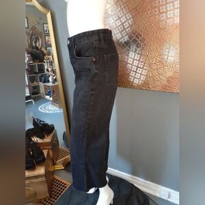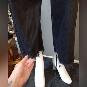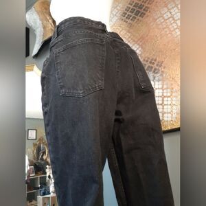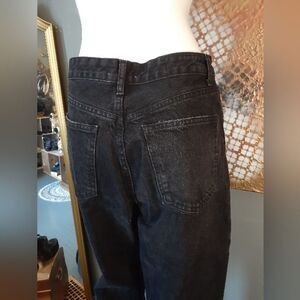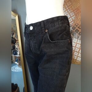 Elevate your wardrobe with these classic black women's wideleg jeans from Zara. Slightly faded black, washed effect with distressed detailing at pockets and hemline. Only worn once, no flaws to note. Mid rise with silvertone button, zipper.. Perfect for any occasion, these jeans offer both style and comfort. Size 6, see flat lay measurements below!