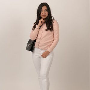 A beautiful pale pink decorated with flower silver bottoms. A comfortable sweater that keeps you warm and makes you look fashionable at the same time. (Cotton).