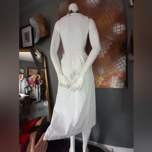 This elegant white midi dress from Zara is perfect for any occasion. Its flowing design offers both comfort and style. A must-have addition to your wardrobe. 97% cotton, 3% elastane. fit and flare design with a stretch ribbed cotton top and poplin lightweight cotton skirt. elastic waist with apron pocket details, pullover style. only worn once, perfect condition. no flaws to note. size small, fits true to size, see flat lay measurements below!