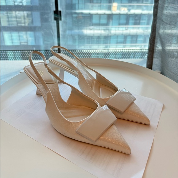 Chic Zara heels with a pointed toe. Cream color with a stylish slingback design. Ideal for elegant outings.