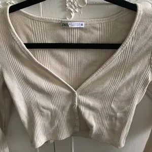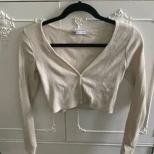 Stylish ribbed crop top. Long sleeves. Button-up front. Perfect for layering.