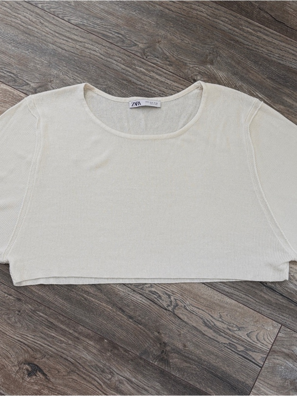 Soft ribbed knit fabric. Cropped silhouette with short sleeves. Simple round neckline for easy layering. Neutral cream hue pairs with many looks.