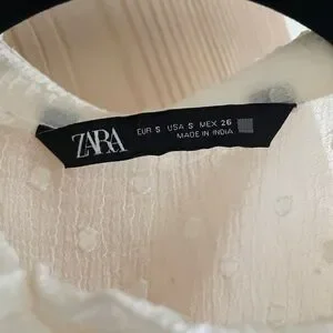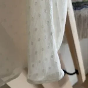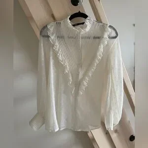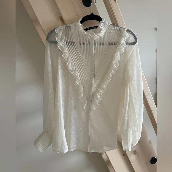 Chic blouse with ruffled trim and button-up front. Sheer fabric with subtle polka dots. Perfect for elegant occasions. There what looks like pen marks on it. I’ve never worn it and I’m not sure how that happened, but I’ve also never tried to get them out.