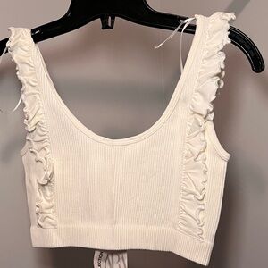 Chic cream crop top with ruffled sleeves. Ideal for a trendy look.
