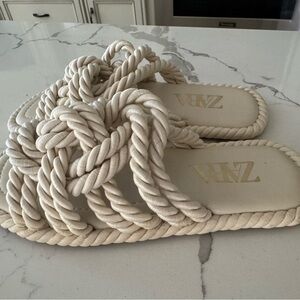 NEVER WORN- BRAND NEW. Missed the return period. Embrace a bohemian vibe with Zara's cream sandals, featuring intricately woven rope straps for a unique and stylish look. These flat sandals offer a comfortable fit, making them perfect for casual summer outings. The neutral cream color ensures versatility, complementing any outfit effortlessly.