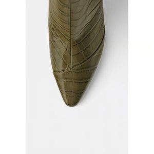 Zara Croc Print Embossed Heeled Olive Green Ankle Boot Booties, Sz EU 39 US 8