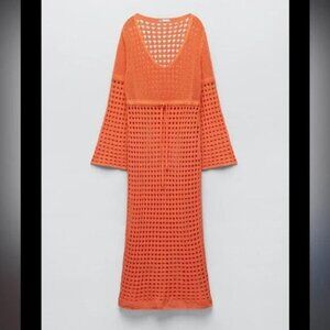 V- neck, long sleeves, and flared cuffs. Adjustable tie waist. Perforated fabric detail.