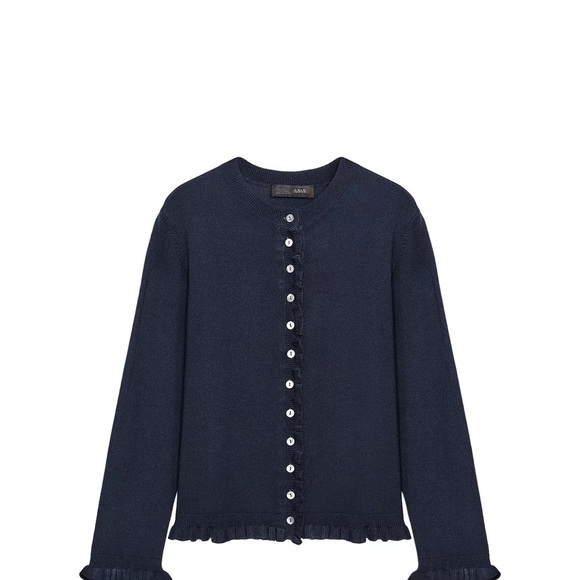 Chic dark blue jacket with ruffle details. Features a stylish button-up front. Ideal for a polished look.