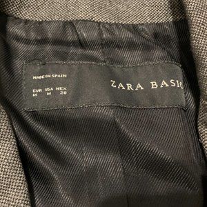 A dark gray tailored blazer with button closure at front. Button closure on cuffs.