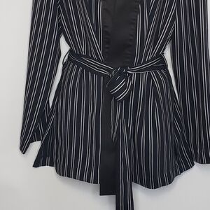 Elevate your style with this chic navy and white striped jacket. With black trim Perfect for any occasion, this jacket offers a sophisticated look with its sleek design. Ideal for adding a touch of elegance to your wardrobe. Detachable tie belt Side slits